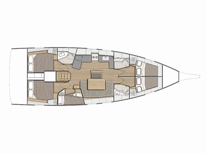 - układ wnętrza: 10 wygodnych koi (w tym jedna z piętrowymi łóżkami), 3 łazienki.